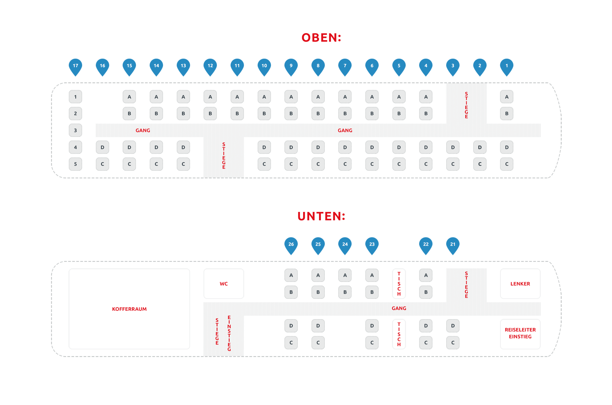 Unsere Stockbusse bieten auf zwei Ebenen komfortabelste Ausstattung im modernen Design und Platz für bis zu 80 Passagiere. Der Stockbus eignet sich perfekt für große Gruppen wie z.B. Schulklassen oder Vereine, die gerne gemeinsam verreisen oder Ausflüge machen.